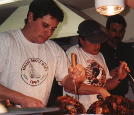 Food prep, 1999 Toliva Shoal banquet : Mike Miranda, Dave Lackey, Rob Rice.