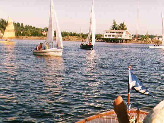 We anchored over the mud flats just North of KGY and drew a crowd of boats, including the Hobie 16, Canadian Laker, Soling, and Star shown.