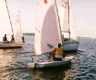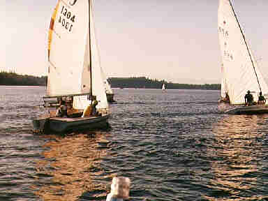 They are off. Mark Snyder in the forground on his Laser, Equinox ahead, Star Duster to leeward, and the Canadian Laker well to leeward