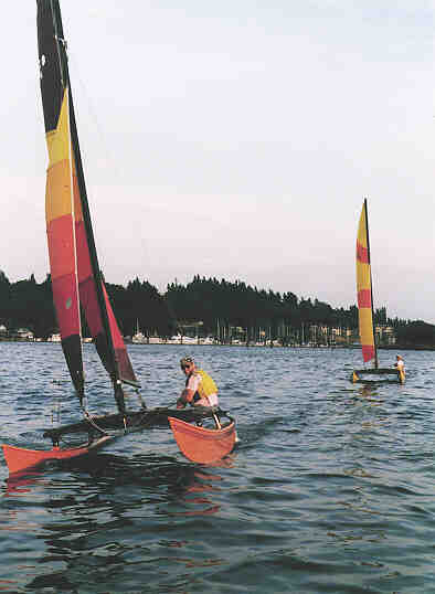 Two photos of the Hobies approaching the finish