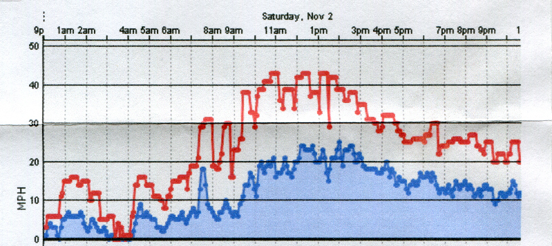 Ken got a graph of the wind from a weather station at Boston Harbor. It shows a wind speed of 15 to 20 kt for most of the race (see the graph, which is in mph) with gust speed of 35 kt. (one should expect gust speed to be 1.5 to 2 times wind speed, as it was). This is a Force 5 wind Beaufort, also called a Fresh Breeze. As it was measured down wind of a bluff, you would expect the wind in Budd Inlet to be ten to fifteen per cent higher, getting into the Force 6 range: a Strong Breeze, sometimes called a Yatchmans Gale.