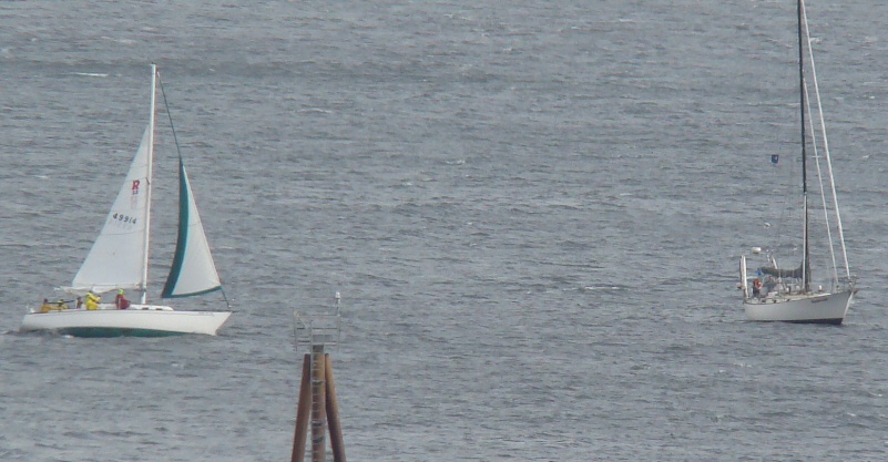 Just minutes after the B Class start, I noticed the shoal marker beginning to rapidly shrink in size. We were blowing across the inlet! I thought at first that our big 3/8 inch anchor chain had parted. A quick trip to the bow revealed a bar-tight chain with anchor still at the proper end. We dragged at about two knots and eventually fetched up solidly about 300 yards away from the original set. The wind was now so strong that we decided to wait for what we knew would only be a short lull. Sharlyn heated up some delicious soup and made sandwiches and crispy apple slices for lunch. Except for a line loudly slapping the mast, it was calm in the cabin. The big waves gave only slight motion.